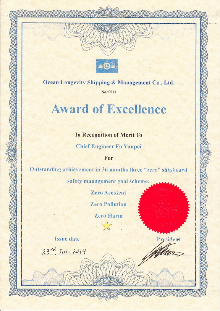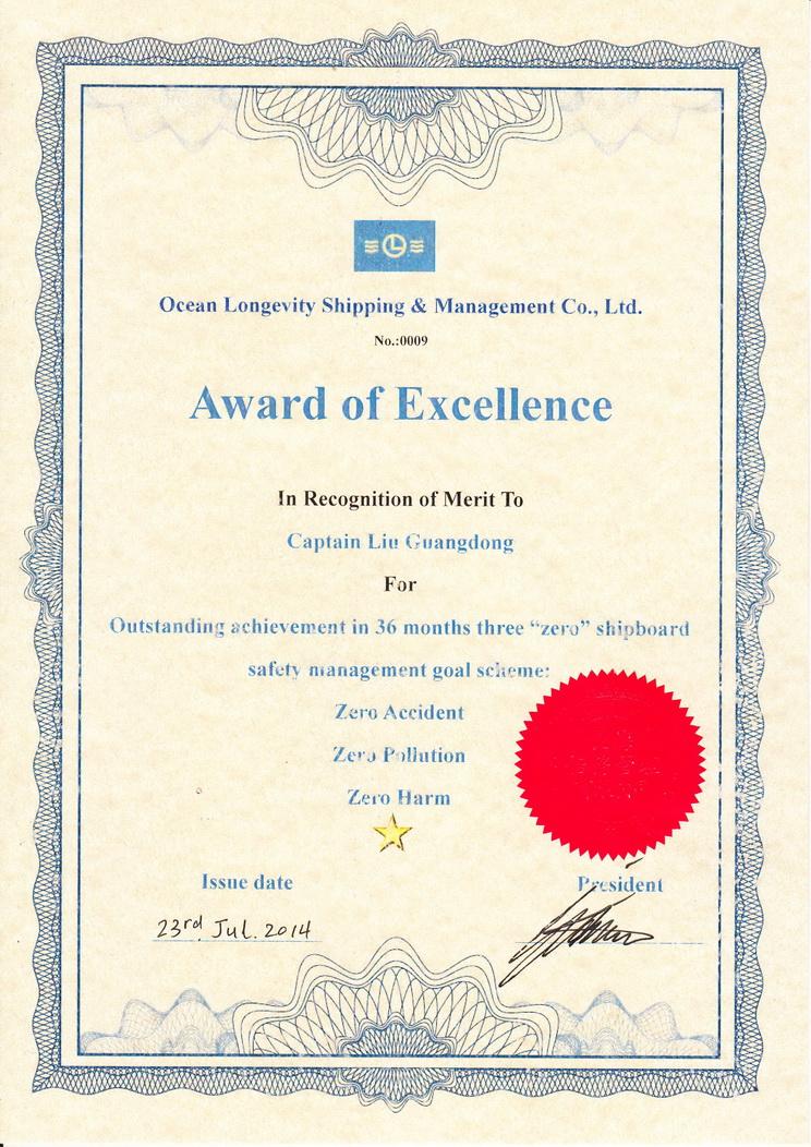 2014年7月1號(hào),經(jīng)過(guò)長(zhǎng)海公司“三零”長(zhǎng)海特別貢獻(xiàn)獎(jiǎng)評(píng)選小組的選拔和評(píng)比,我司又有3名船員(分別是:劉廣棟船長(zhǎng)、傅云培輪機(jī)長(zhǎng)和宋忠軒輪機(jī)長(zhǎng))榮獲長(zhǎng)海特別貢獻(xiàn)獎(jiǎng),這是我司船員繼上次2013年10月9日我司李耀鵬船長(zhǎng)和艾紅杰船長(zhǎng)光榮地獲得首批獎(jiǎng)勵(lì)并獲頒1星長(zhǎng)海三零特別貢獻(xiàn)獎(jiǎng)后,再次獲得該榮譽(yù),長(zhǎng)海遠(yuǎn)航集團(tuán)的桂四??偛孟蛞陨汐@得該榮譽(yù)的五名船員親自簽發(fā)榮譽(yù)證書(shū)。