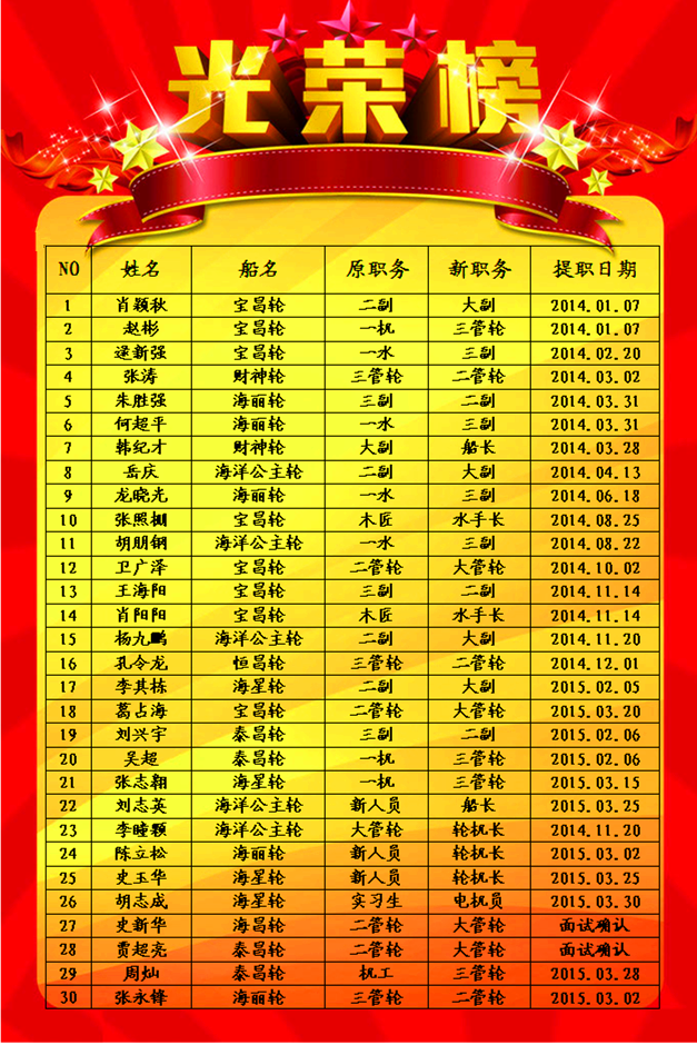 自2014年初始至今,我司在香港船隊服務(wù)的船員據(jù)不完全統(tǒng)計,截止目前共計30名船員通過自己在香港長海船隊工作一線不懈的努力和業(yè)務(wù)學(xué)習(xí),經(jīng)船舶領(lǐng)導(dǎo)及我司船員部主管的的推薦和船東考核,其工作態(tài)度和業(yè)務(wù)技能普遍得到船東的認(rèn)可,職務(wù)獲得晉升。他們通過自己工作的努力成為我司服務(wù)香港長海船隊的中堅力量,為我司進(jìn)一步加強和擴大與香港長海公司的進(jìn)一步業(yè)務(wù)合作打下了人力資源基礎(chǔ),我們對他們的提職和事業(yè)的發(fā)展表示熱烈的祝賀!