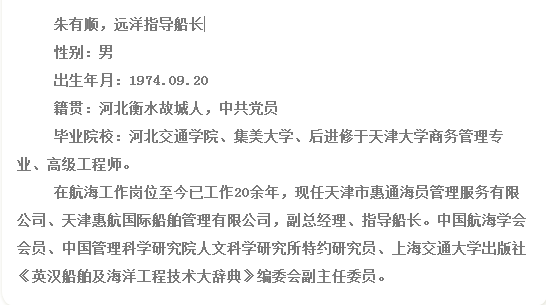 ???朱有順船長(zhǎng)長(zhǎng)期從事航運(yùn)管理和領(lǐng)導(dǎo)一線工作,積累了豐富的航海實(shí)踐工作經(jīng)驗(yàn),熟悉國(guó)際公約和體系管理,科學(xué)管理,在平凡的工作崗位做出了不平凡的業(yè)績(jī),帶領(lǐng)整個(gè)船隊(duì)改革創(chuàng)新,起到領(lǐng)頭作用,從90年代的“學(xué)習(xí)華銅海標(biāo)兵”到2009年的“索馬里抗擊海盜英雄”,先后多次被評(píng)為公司“勞動(dòng)模范”、“優(yōu)秀黨員”和“優(yōu)秀員工”等榮譽(yù)稱號(hào)。在2008年多次途經(jīng)索馬里航線,長(zhǎng)期與海盜斗智斗勇,在其過程中積累和總結(jié)了大量實(shí)際有效的防海盜經(jīng)驗(yàn),并形成了全面成熟有效的方案,在整個(gè)船隊(duì)推廣使用,為船隊(duì)成功抗擊海盜積累了需要寶貴的經(jīng)驗(yàn)。其在途經(jīng)亞丁灣索馬里沿岸抗擊海盜的英勇事跡曾被天津日?qǐng)?bào)社和天津都市報(bào)道等欄目整版報(bào)道,廣為美傳,被譽(yù)為“中國(guó)抗擊海盜第一人”。