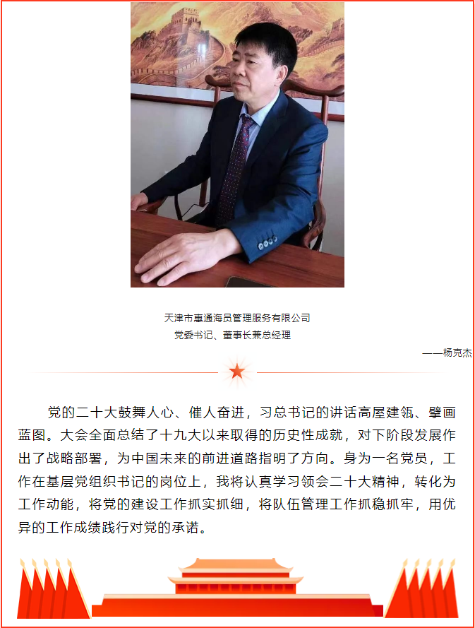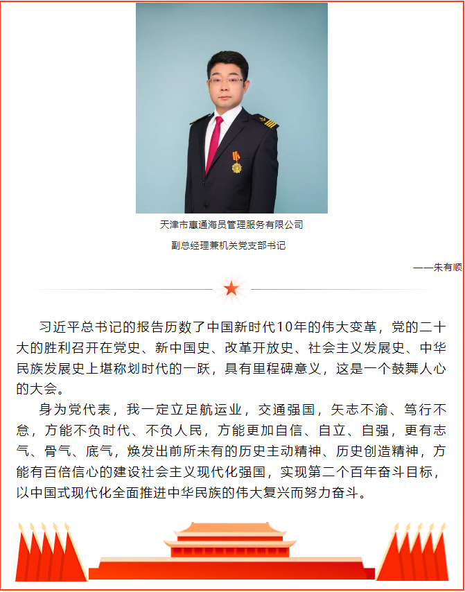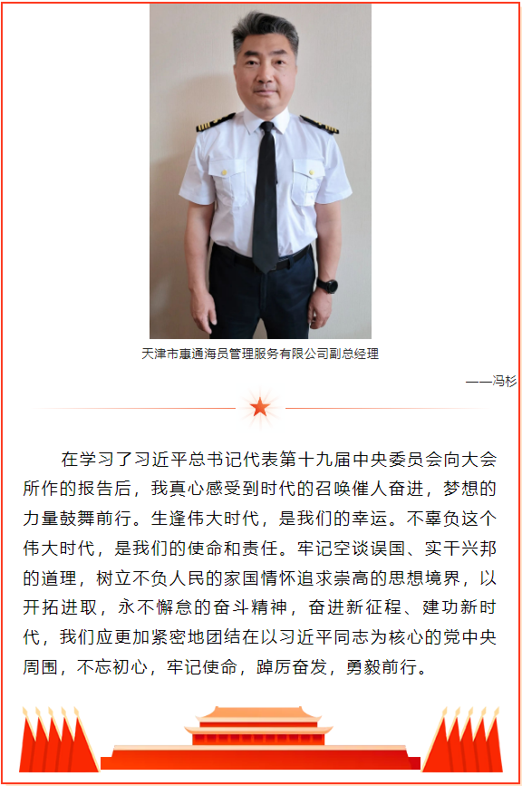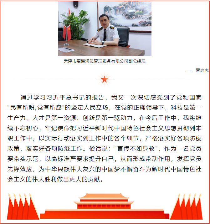 【黨建園地】天津惠通黨員干部分享黨的二十大報(bào)告學(xué)習(xí)感悟 時(shí)間:2022-10-19 點(diǎn)擊:1854次 上一篇:天津惠航國(guó)際船舶管理有限公司順利完成勞氏DOC2022年度審核 下一篇:公司組織員工收聽收看黨的二十大開幕會(huì)
