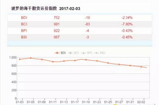 ? ? ??被譽為國際干散貨運輸市場走勢的晴雨表的波羅的海干散貨指數(shù)(BDI)在此期間已12個交易日連續(xù)下跌回調(diào),截止2月3日BDI收報于752點、自1月中旬以來已經(jīng)回調(diào)了200點,跌幅達21%。