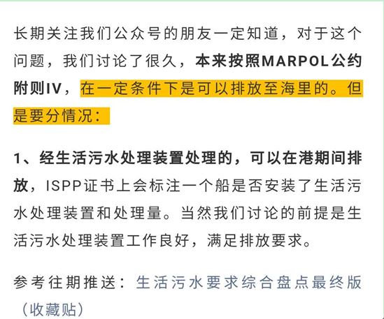 5、船舶在某個(gè)國(guó)家水域內(nèi)該國(guó)對(duì)于生活污水有特殊規(guī)定的,遵守該國(guó)的規(guī)定(公約中的“較寬”不是更寬松,而是更寬泛即更嚴(yán)格);所以每到一個(gè)港口前,有必要咨詢代理關(guān)于該國(guó)港口對(duì)于生活污水處理的規(guī)定,以免出現(xiàn)問(wèn)題。